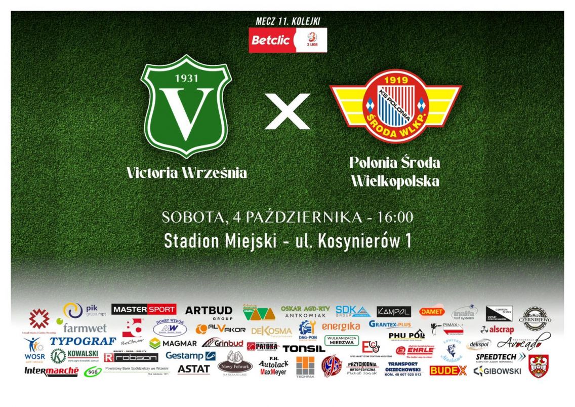 Betclic 3 liga Victoria Września - Polonia Środa Wlkp. 4.10.2025 16.00 Września Proton B klasa Victoria II Września -Sparta Sklejka Orzechowo 5.10.2025 16.00 Września 1 Liga Okręgowa Junior B1 ZKS Orły Zagórów - Victoria Września ...