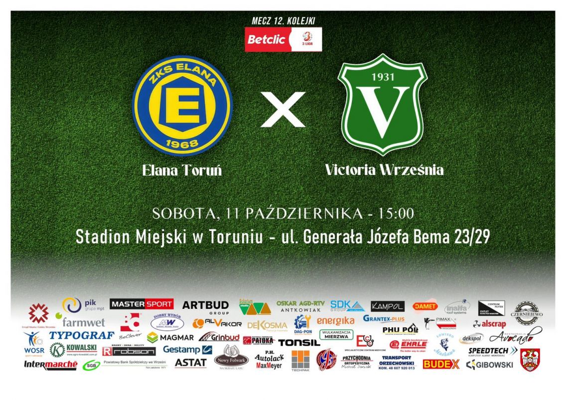 Betclic 3 liga Elana Toruń Victoria Września 11.10.2025 15.00 Toruń Proton B klasa Płomień Nekla - Victoria II Września 11.10.2025 13.00 Nekla 1 Liga Okręgowa Junior B1 ZKS Orły Zagórów - Victoria Września ...
