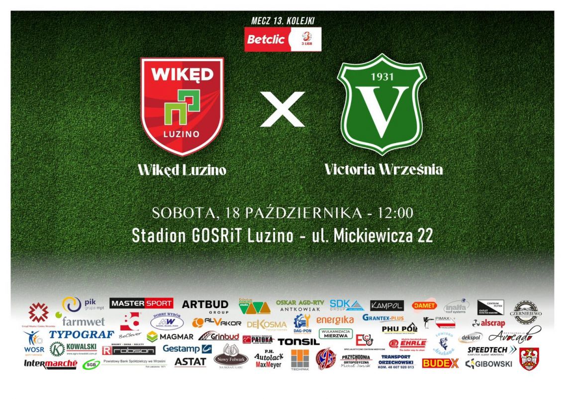 Betclic 3 liga Wikęd Luzino Victoria Września 18.10.2025 12.00 Luzino Proton B klasa Victoria II Września - Maratończyk Brzeźno 19.10.2025 15.00 Września 1 Liga Okręgowa Junior B1 Orlik Miłosław - Victoria Września 19.10.2025 14.00 ...