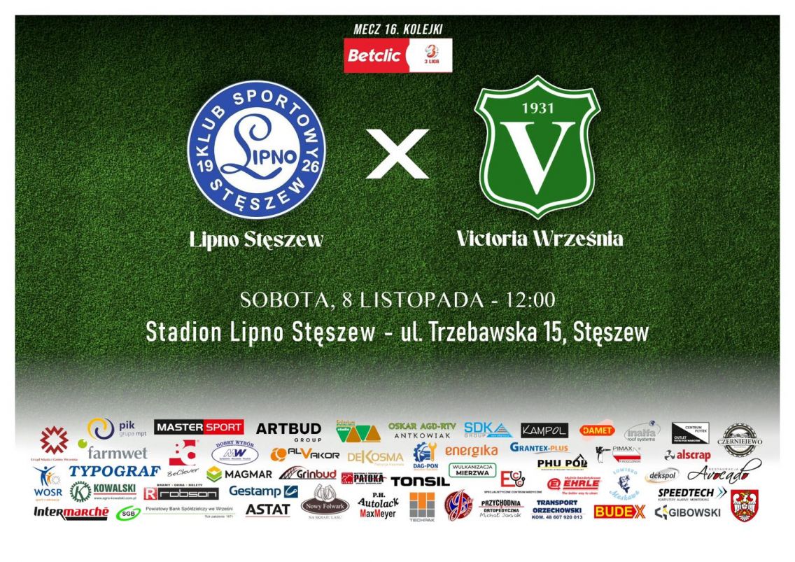 Betclic 3 liga Lipno Stęszew - Victoria Września 8.11.2025 12.00 Stęszew 2 Liga Wojewódzka Junior B2 Victoria Września - Rawia Rawicz 8.11.2025 14.00 Września 2 Liga Wojewódzka Trampkarz C1 Victoria Września - UKS APR LAMPART...