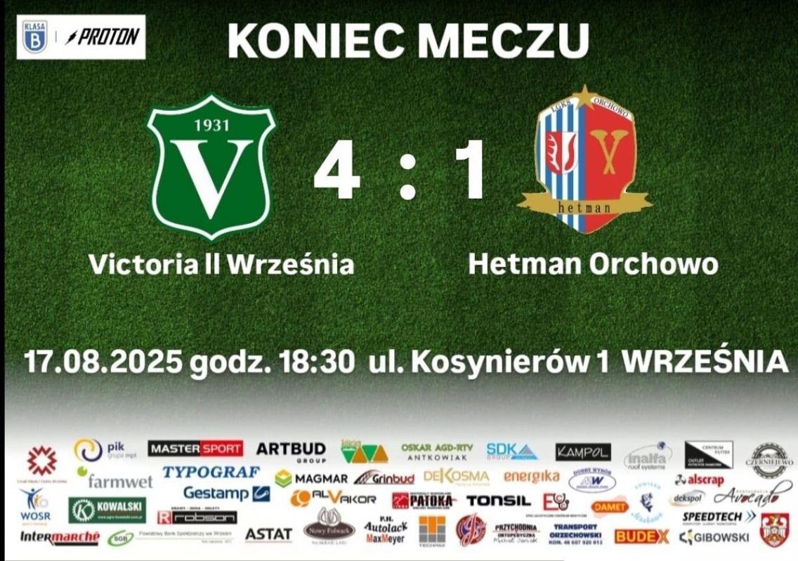 Victoria Września - Hetman Orchowo 4:1 Bramki dla zdobyli: Spychała Piotr Skrzypczak Oskar Chałupniczak Kacper Trzebiatowski Bartosz Swój pierwszy mecz ligowy rozegrał drugi zespół Victorii Września. Debiut wypadł bardzo dobrze, podopieczni trenera...