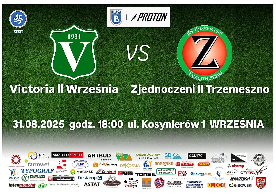 Betclic 3 liga Victoria Września - Pogoń Nowe Skalmierzyce 30.08.2025 16.00 Września Proton B klasa Victoria II Września - Zjednoczeni IITrzemeszno 31.08.2025 18.00 Września 1 Liga Okręgowa Junior B1 Polonia Golina - Victoria...