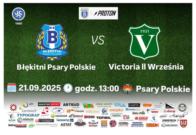 Betclic 3 liga Victoria Września - Pogoń II Szczecin 20.09.2025 16.00 Września Proton B klasa Błękitni Psary Polskie II Victoria II Września 21.09.2025 13.00 Psary Polskie 1 Liga Okręgowa Junior B1 Victoria Września -Polonia Golina 21.09.2025 10.00...